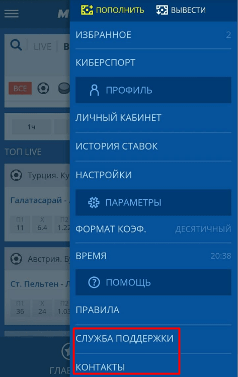Мобильная версия сайта – в правом верхнем углу кликните по значку профиля и в блоке «Помощь» выберите «Контакты».